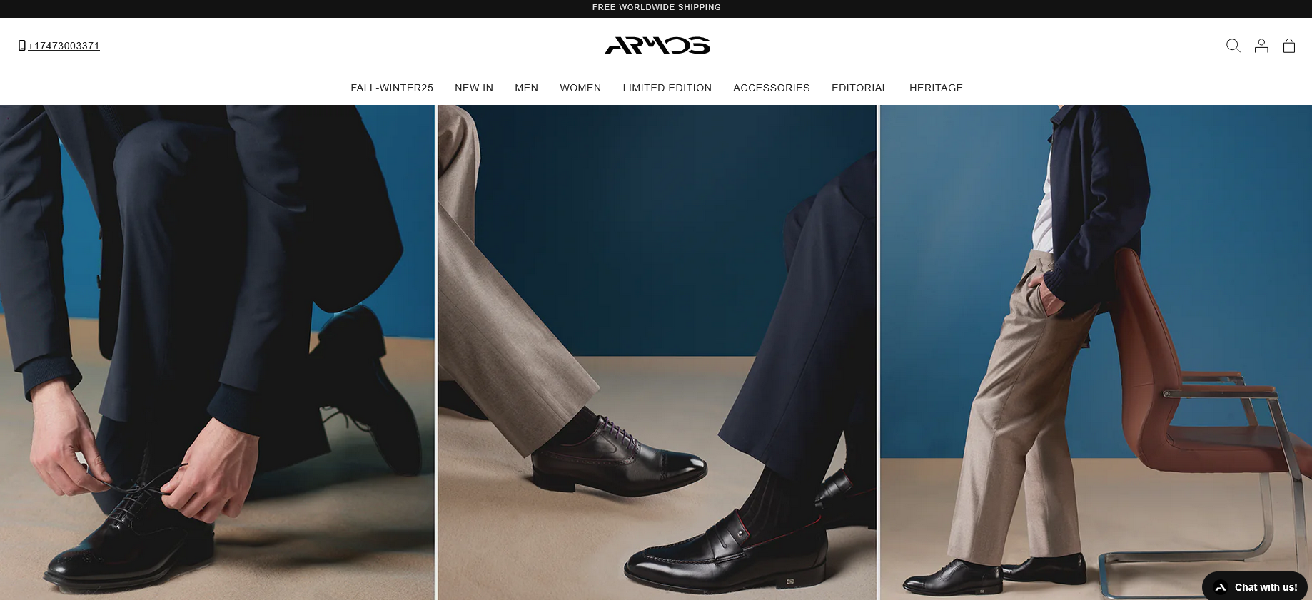 ARMOS Shoes is a global brand that designs and manufactures high-end leather footwear and accessories. Their products are handcrafted using full-grain Italian leather, employing traditional patina and craftsmanship techniques that reflect over three decades of experience in leatherwork.